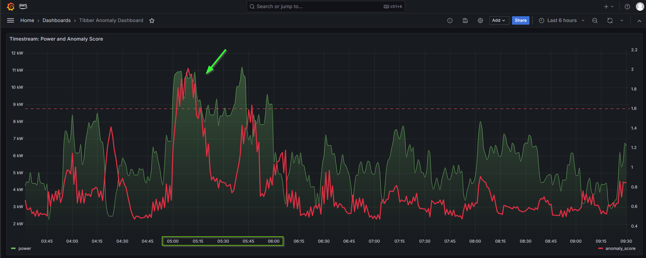 When charging starts, power consumption spikes and anomaly score rises above the threshold