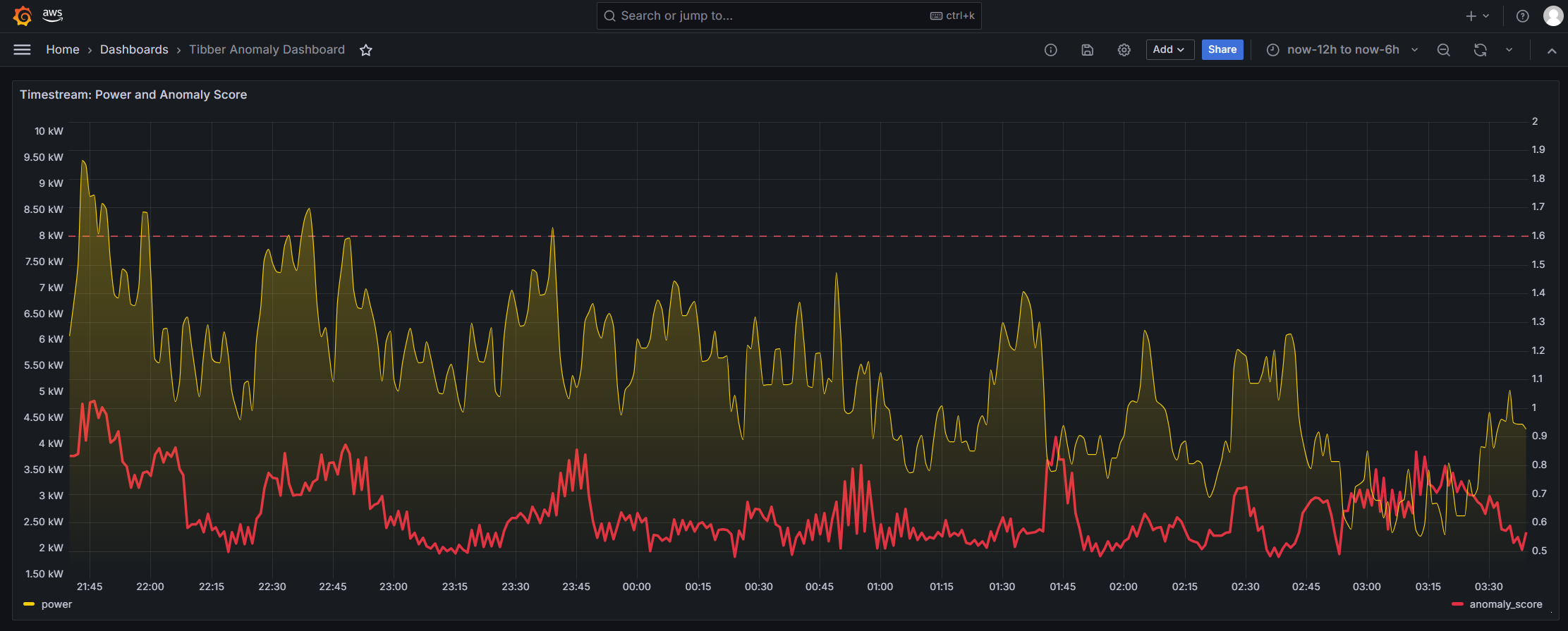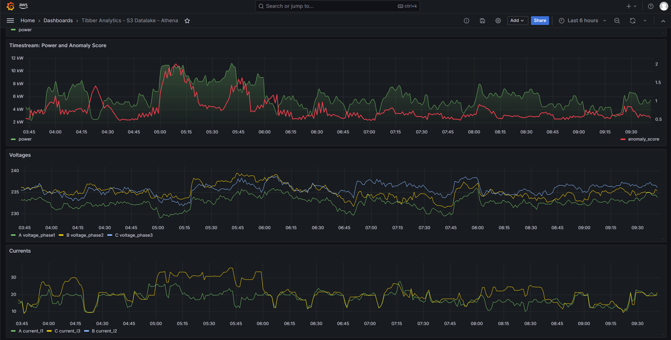 - Visualization: Grafana queries both Timestream DB (for anomaly scores) and Athena (for historical analysis) to create real-time dashboards
